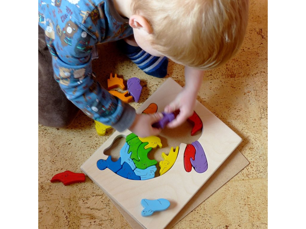 Tento duhový zajíc je vhodný i pro menší děti - pořadí barev usnadňuje umístění jednotlivých dílků. Zajíci jsou ale malovaní z obou stran, takže dítě bude muset přijít na to, jakou stranou zajíček do skládačky patří.